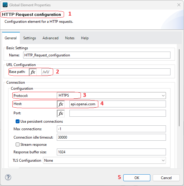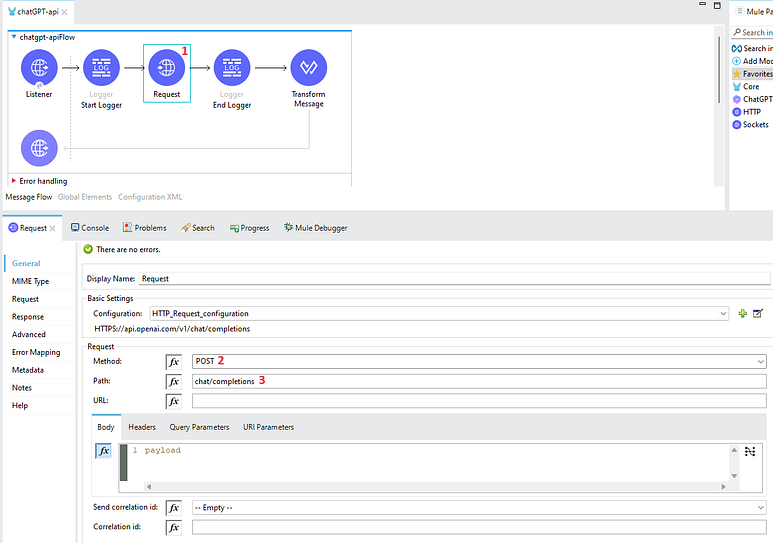 5. OpenAI API Çağrısı: MuleSoft’ta HTTP Request Connector’ı kullanarak OpenAI API’sine Request body içerisine aşağıdaki gibi bir istek gönderin.