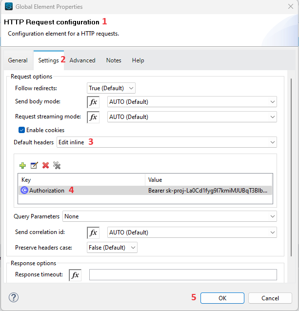 2. ‘HTTP İstek Yapılandırması’nda, ‘Ayarlar’ sekmesine gidin ve varsayılan başlıklar seçeneğinde, açılır seçenekten ‘Satır içi düzenle’yi seçin ve API anahtarını yapılandırın.